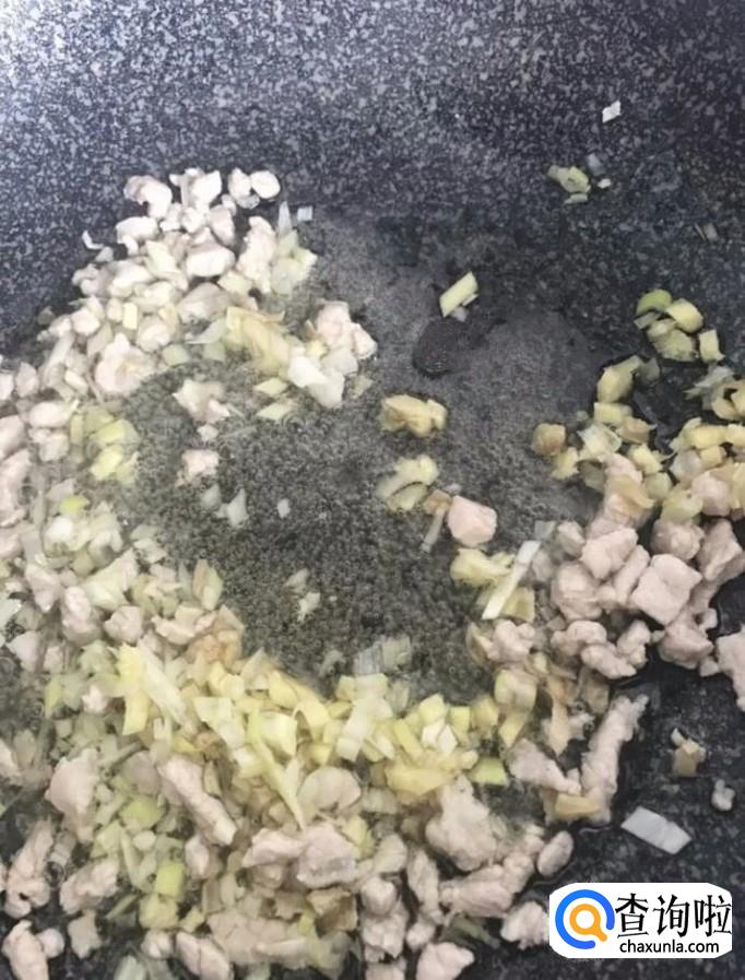 接着我们另起锅,放入少许油,放入葱姜末。肉末,把它炒香