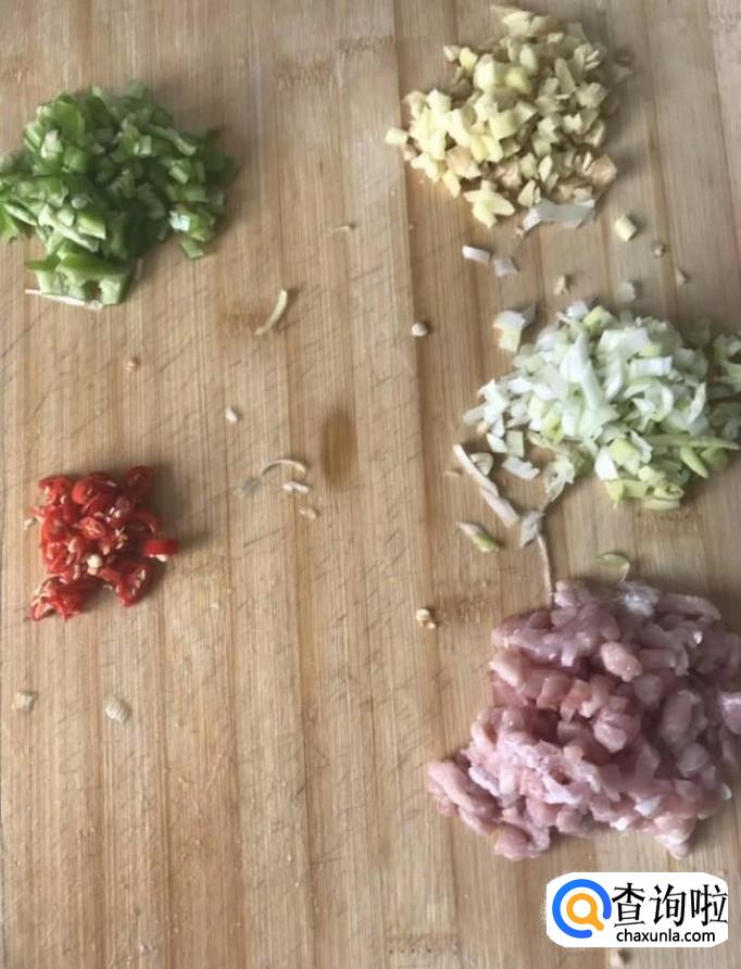 首先我们将葱姜剁碎,肉末、尖椒、小米辣分别切成小丁状,备用