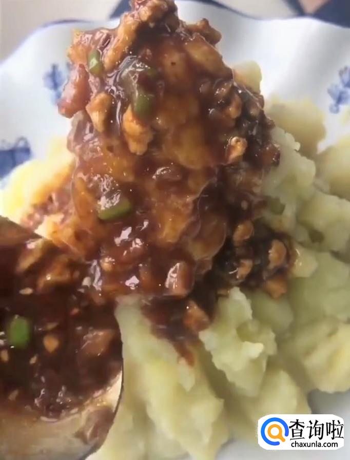然后我们将土豆泥堆成山状,把汤汁浇在上面