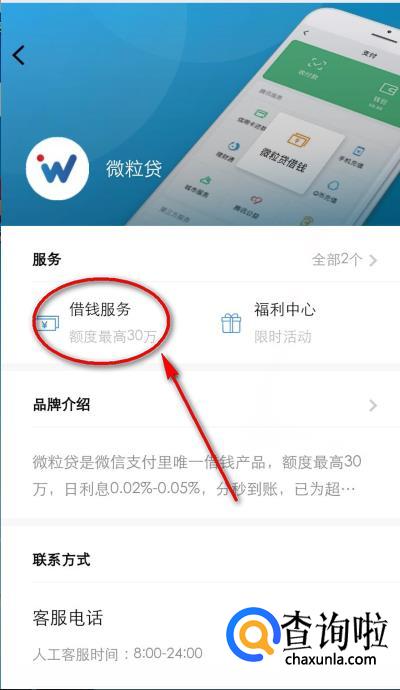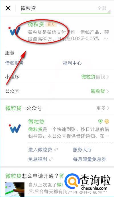 然后再点击具有官网标记的“微粒贷”,微粒贷是微信中唯一的借钱产品。