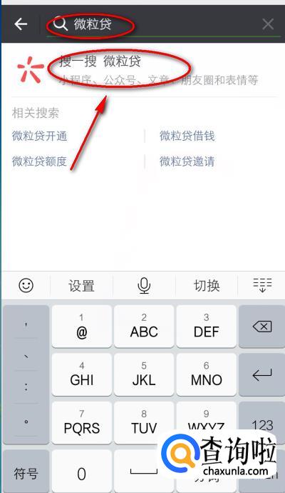 然后再输入“微粒贷”,点击下方的“微粒贷”公众号。
