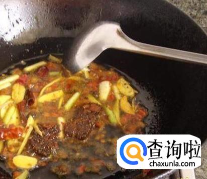 锅中加油,8成热加入酸菜、泡椒、青花椒,老抽,生姜,爆炒。然后加水。
