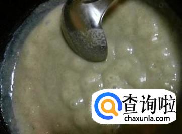 锅里烧一锅水,待水烧开后,将搅拌均匀的绿豆粉倒入,再加入少许的白糖,边煮边用勺子搅拌。