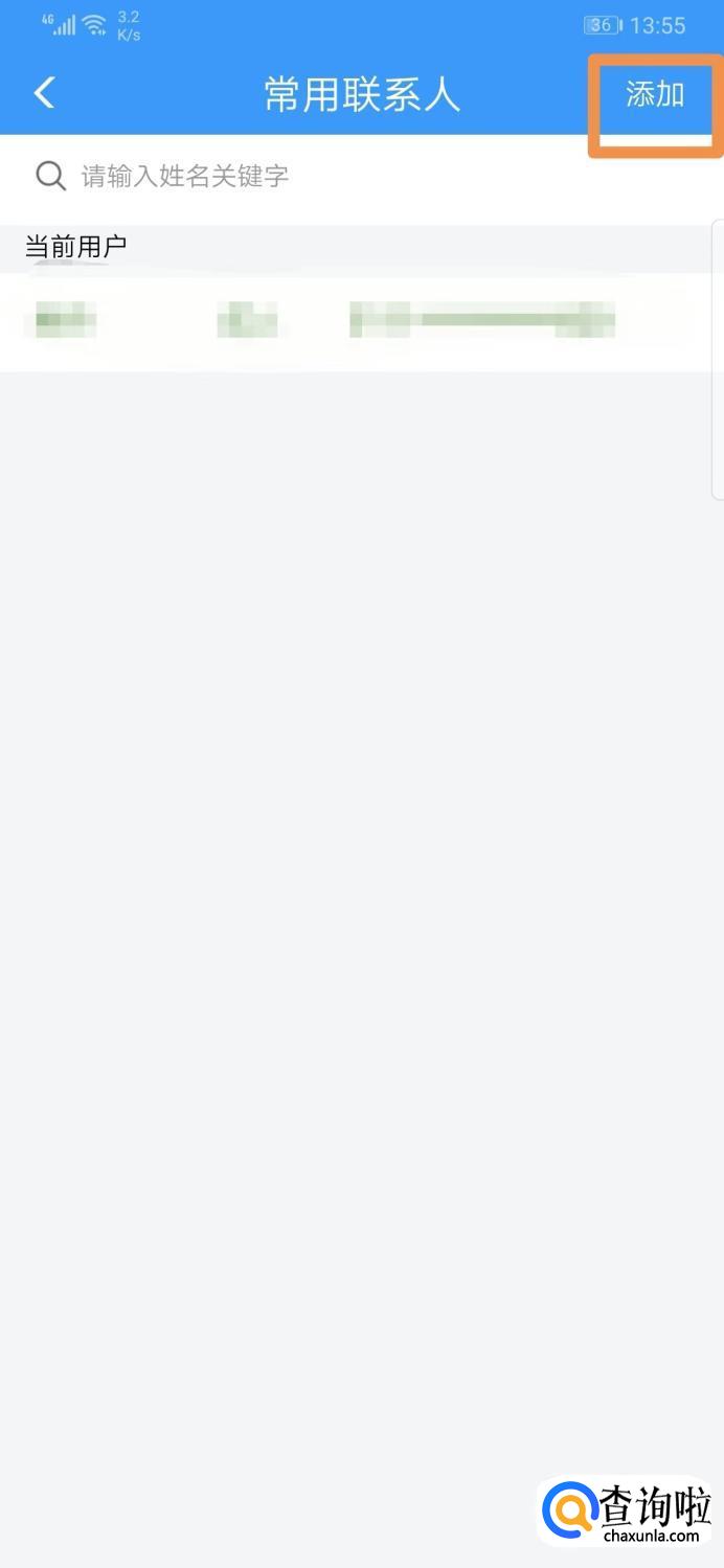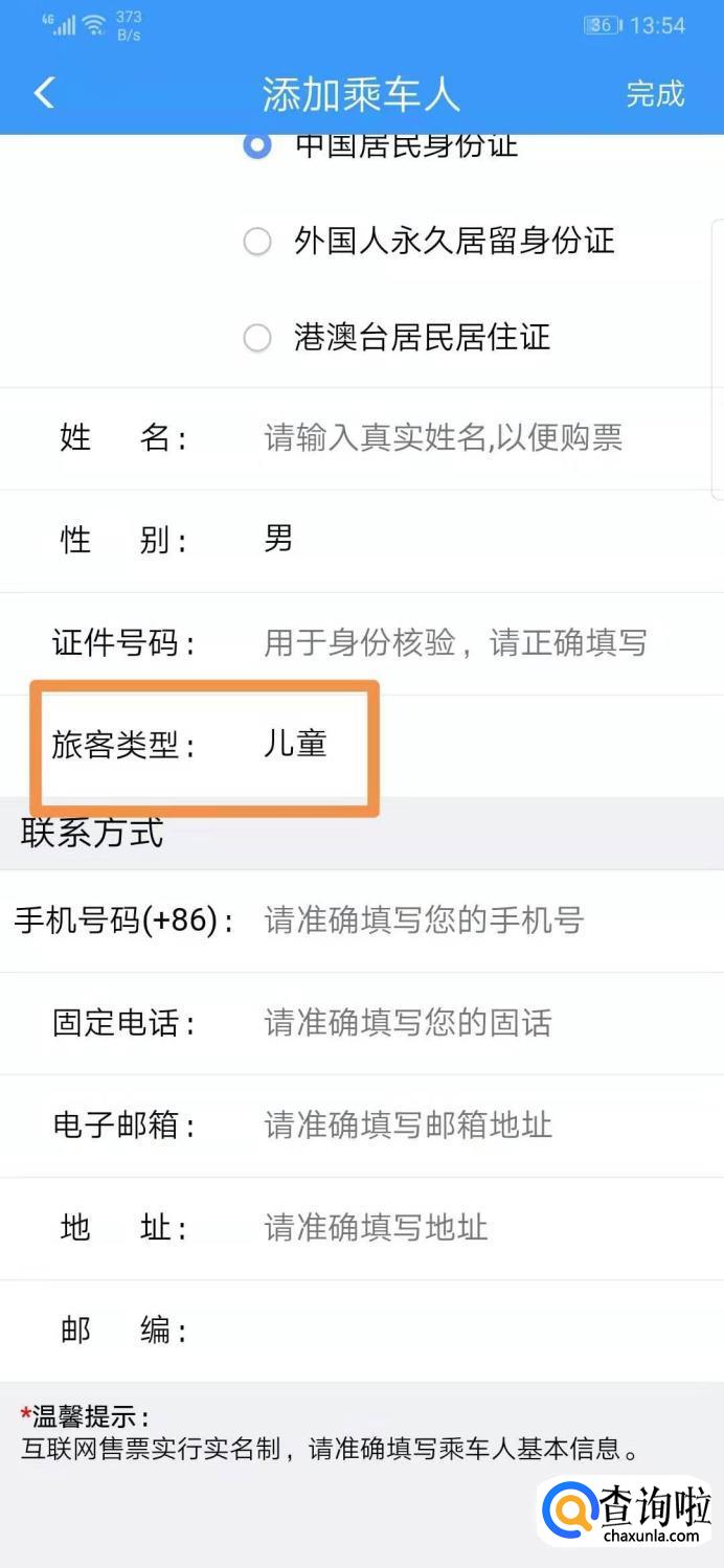 进入【常用联系人】界面,点击页面右上角的【添加】,然后为为小朋友填写联系人信息,证件类型、证件号码和手机号码填写父母的即可,其中旅客类型选择“儿童”。