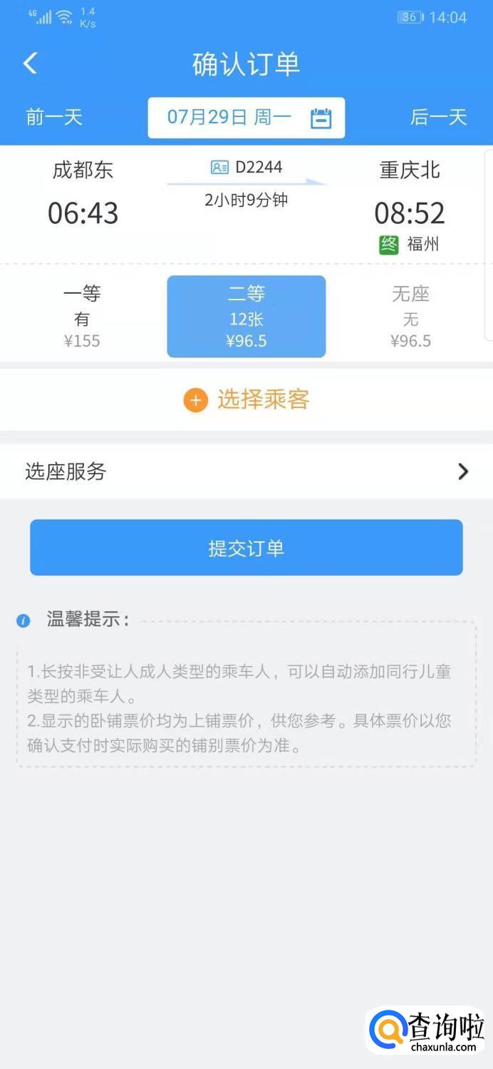 然后在铁路12306app中,选择自己想要乘坐的车次,添加乘车人之后,就可以点击购票,其中旅客类型选择“儿童”。