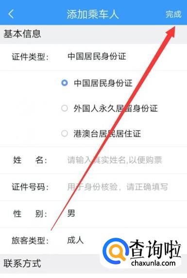 输入需要添加的联系人信息,点击“完成”即可,如图所示。