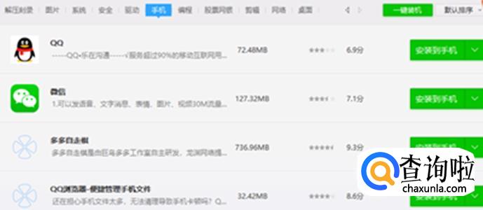 点击进入“手机”以后,我们可以看到很多软件,选择你想要下载到手机上的软件,然后点击软件后面的“安装到手机”。