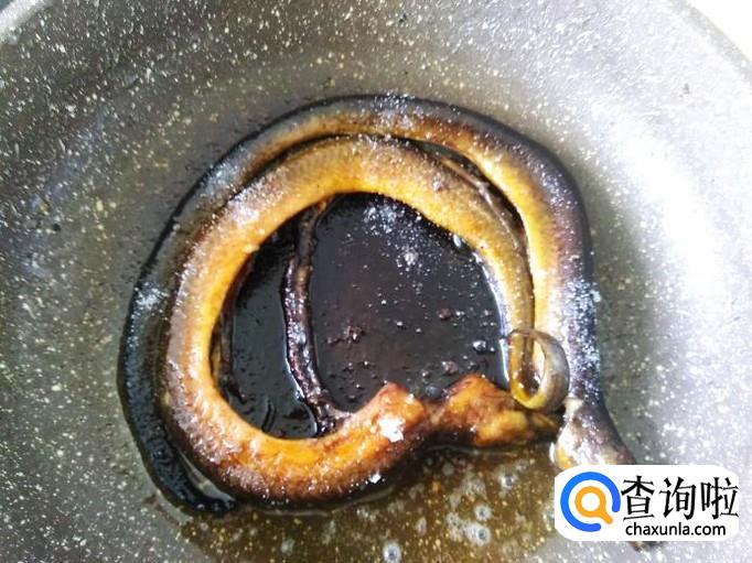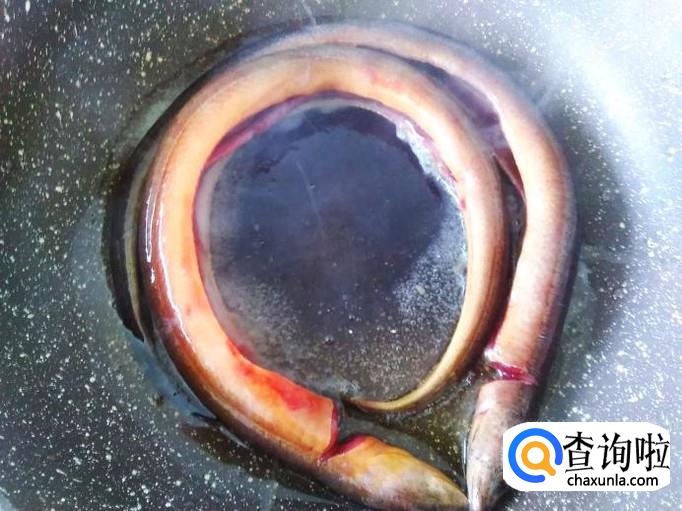 开火下油,油量比平常炒菜多些,然后放黄鳝进去炸煎。