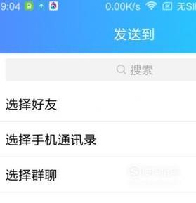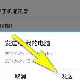如果想从手机上把文件传到电脑上,同样是通过QQ来实现。在手机上,手指点一下文件,弹出发送到的页面。在这里选择:我的电脑