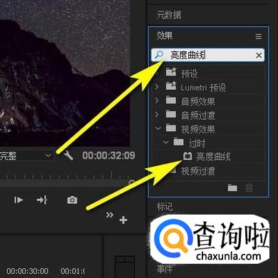 鼠标点击效果组面板。并在搜索框内输入关键词:亮度曲线;下面即显示出该效果命令。