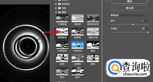 进入滤镜库界面,在“素描”中找到“铭黄渐变”效果,调整细节和平滑度进行添加。