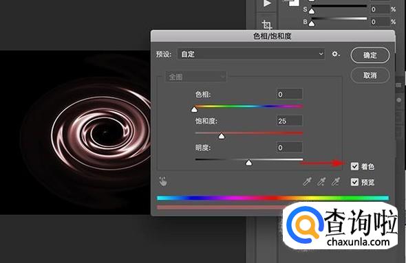 之后开始调色,按CTRL+U进入色相饱和度设置界面,勾选着色,将色相和明度设置为0,饱和度设置为25,就得到巧克力效果图片了。