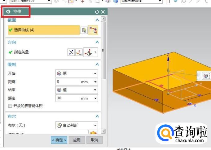 拉伸一个100x100x30的长方体作为演示所用。
