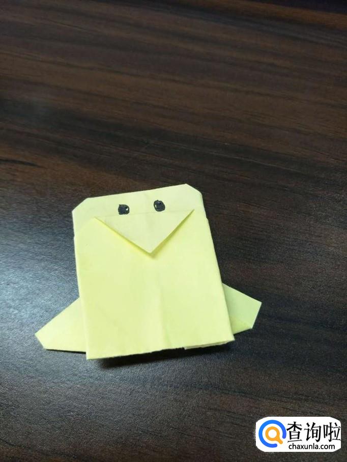 最后一步,把折纸反过来,画上企鹅的眼睛,企鹅折纸就完成了。