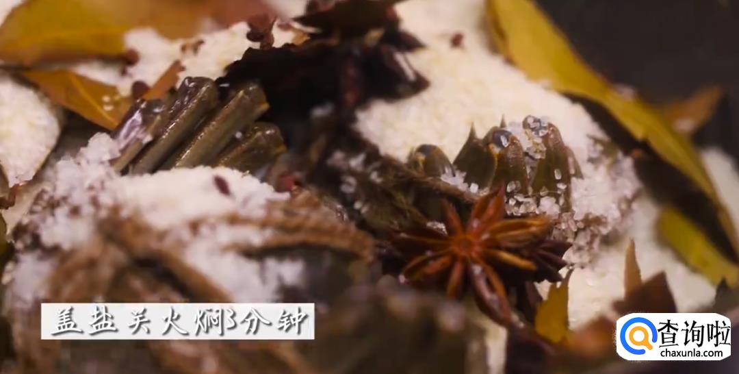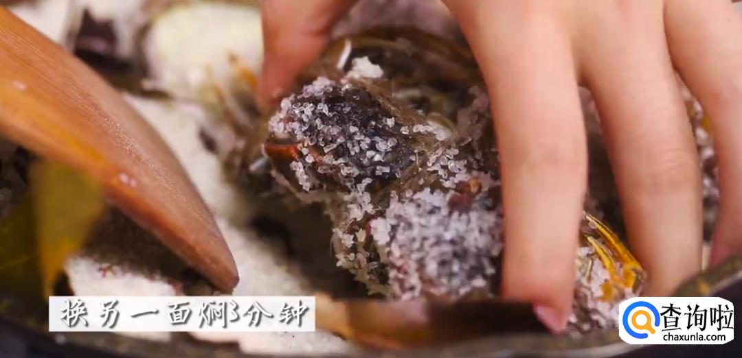 然后,把刚才腌制好沥干的螃蟹放进去,将盐覆盖在螃蟹上,然后关火焖3分钟左右。