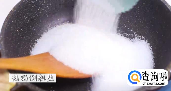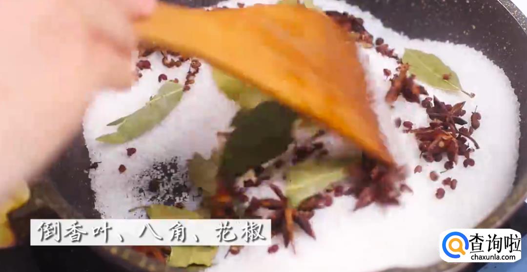 将锅烧热,倒入粗盐,翻炒几下,再加入香叶、八角和花椒,一起翻炒。