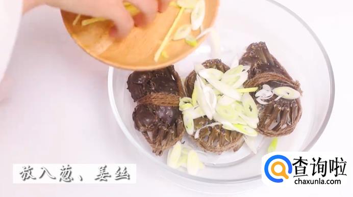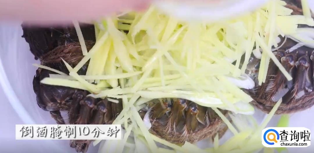 接着,将切好的姜丝和葱丝放进装螃蟹的碗中,再倒入花雕酒,腌制10分钟。