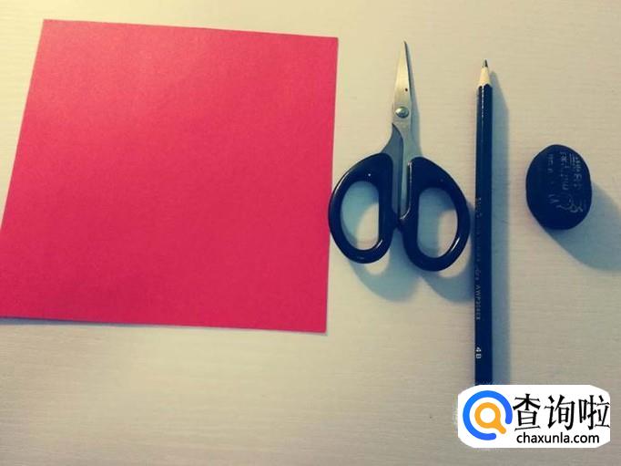 首先,我们准备好剪纸所需要用到的工具,红色方形彩纸,剪刀,铅笔和橡皮擦