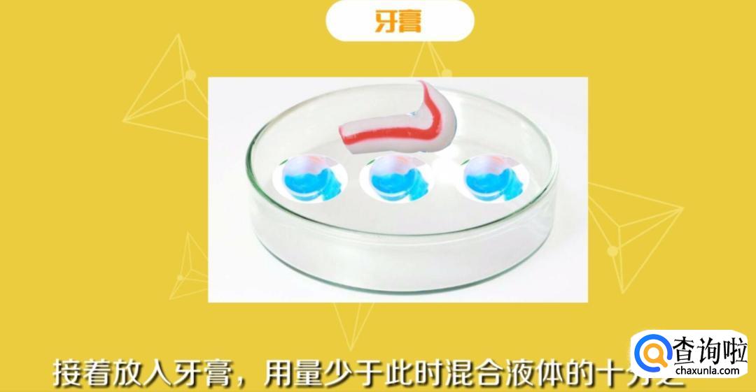 紧接着放入牙膏,用量少于此时混合液体的十分之一,大概一到两厘米长度即可,因为放太多之后会比较粘手。