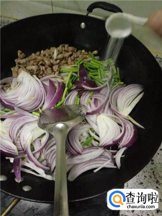 放入洋葱和蒜薹进行翻炒,并加一点盐。