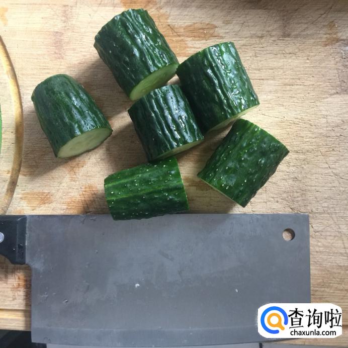 首先将黄瓜切成长短均匀的段。
