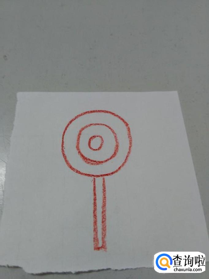 用红笔在圆形下面,画一条细长的条形,表示棒棒糖的棍。