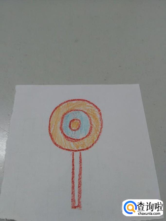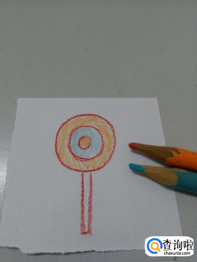 最后,用桔色和蓝色将三个圆圈涂上颜色,表示各种口味的糖,棒棒糖就画完了。
