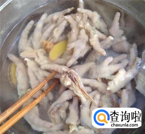 锅里放入几片姜,煮开半锅水,水沸腾后,把鸡脚倒入锅中,加入少许料酒,去腥味,把鸡脚煮熟煮软。