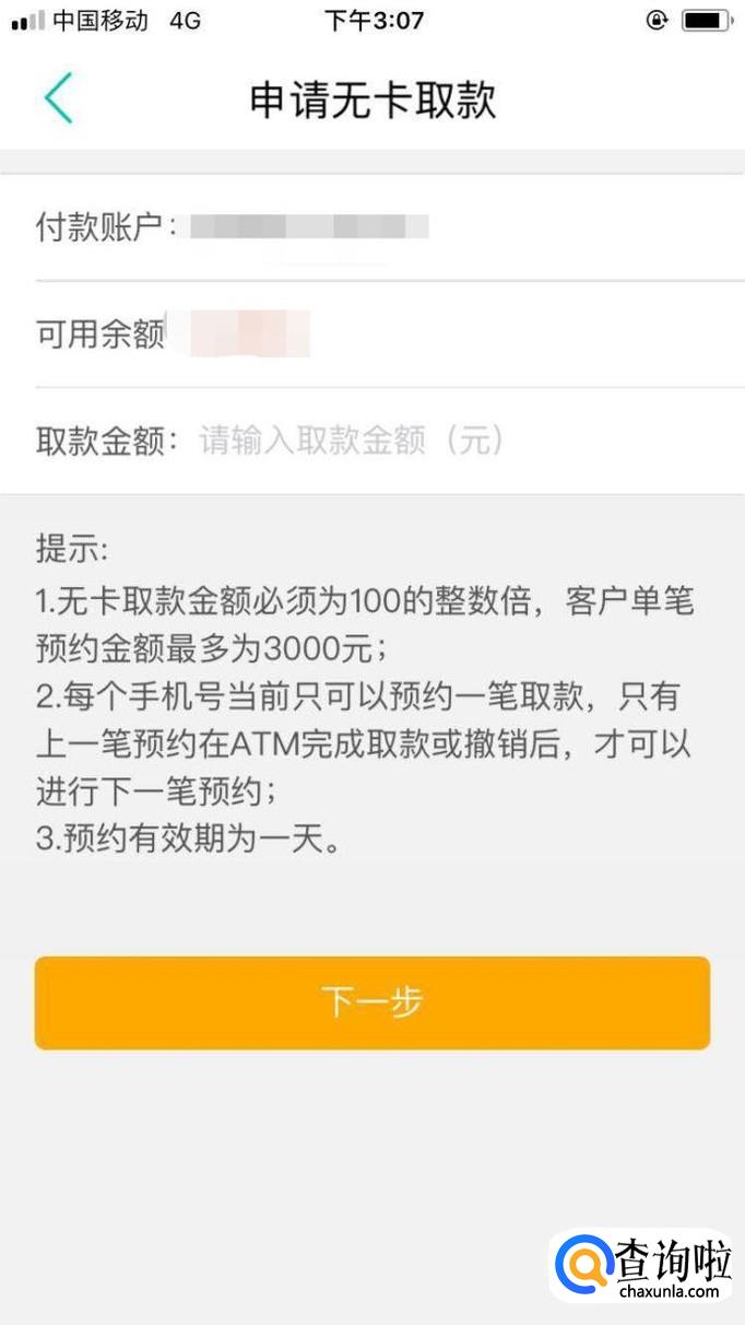 这里就可以申请无卡取款了,那这里有几项注意事项1、无卡取款金额必须要100的整数倍单笔预约金额最多为3000元。2、每个手机号当前只可以一笔取款,只有上一笔预约在ATM完成取款或者撤销后,才可以进行下一笔预约。3、预约有效期为一天。