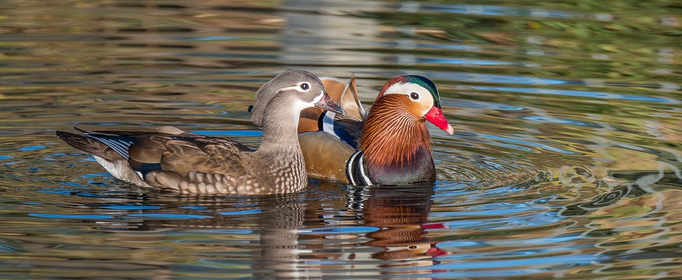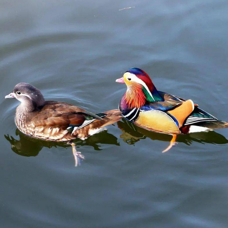鸳鸯属雁形目的中型鸭类,大小介于绿头鸭和绿翅鸭之间,体长38~45厘米,体重0.5千克左右。雌雄异色,雄鸟嘴红色,脚橙黄色,羽色鲜艳而华丽,头具艳丽的冠羽,眼后有宽阔的白色眉纹,翅上有一对栗黄色扇状直立羽。雌鸟嘴黑色,脚橙黄色,头和整个上体灰褐色,眼周白色,其后连一细的白色眉纹。