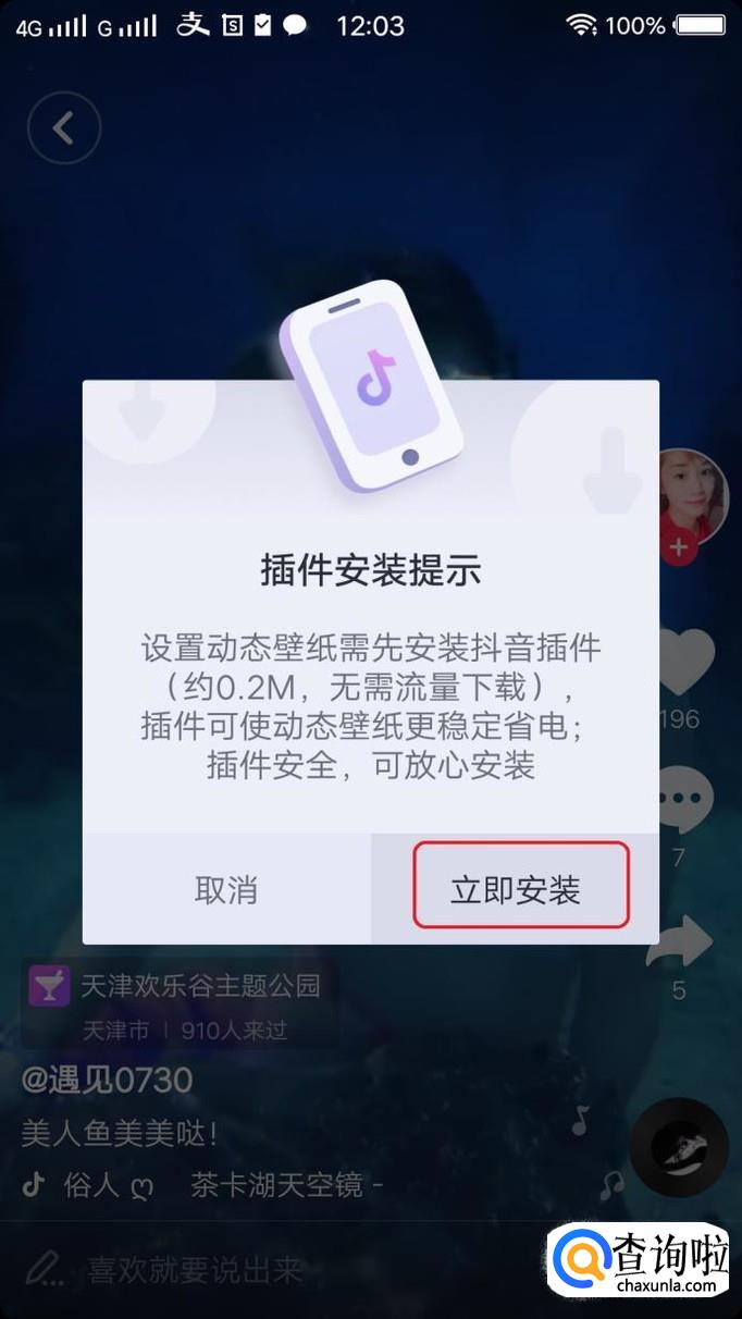 第一次制作动态壁纸需要安装一个抖音插件,我们点击“立即安装”。