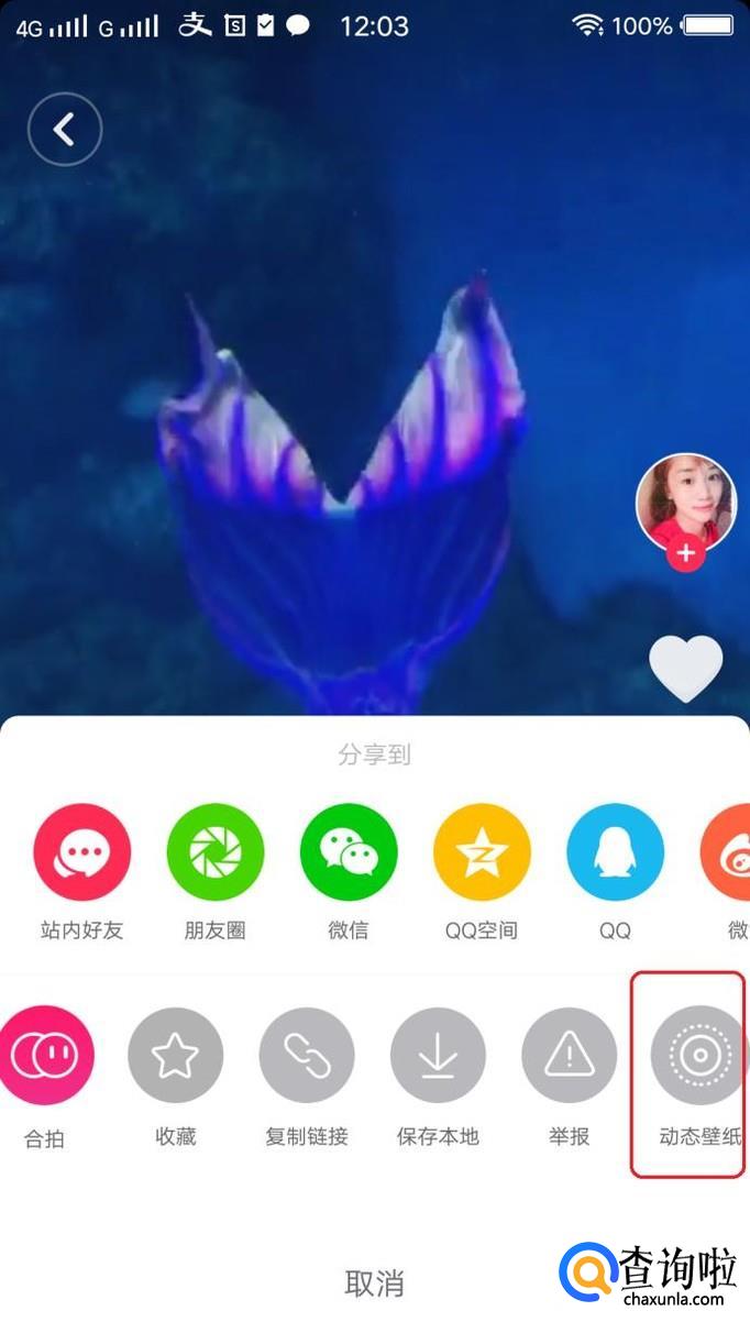 出来分享选项面板,我们看到,第二行有一个“动态壁纸”选项,我们点击一下。