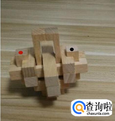 我们先将标记红点的长条取出,取完红色的长条以后,再在将标记黑点和红点的木条取出。