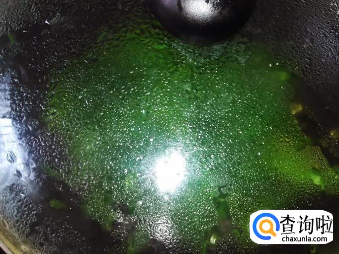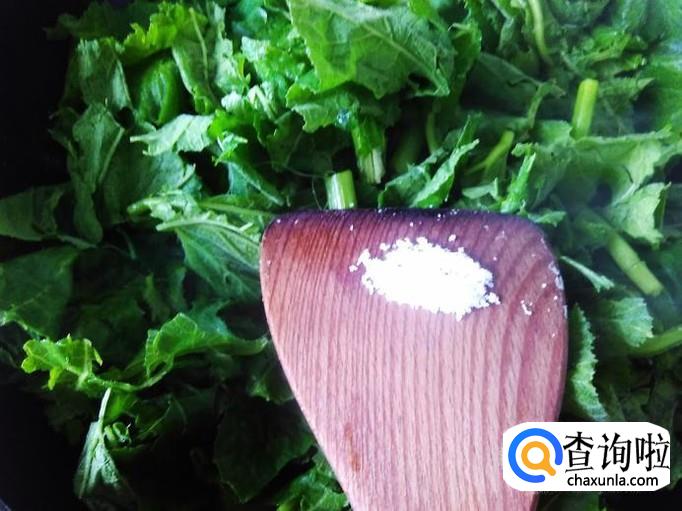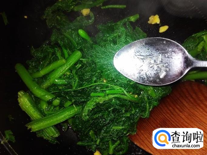 南瓜苗下锅,加适量的盐翻炒至变色。