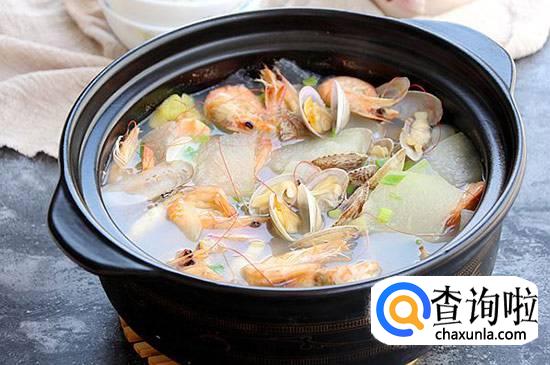 材料:鲜虾、海虹、花蛤、冬瓜、葱姜、香菜、盐、鸡精、香油。