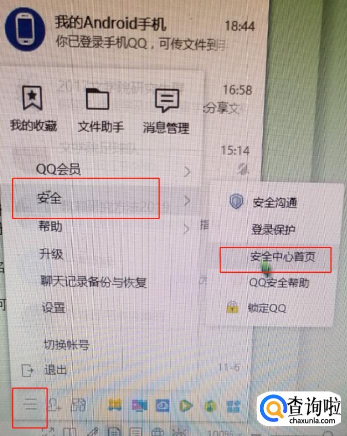 首先在qq主页面的左下角找到菜单标记,点击出现新的菜单,找到安全选项,进入安全中心。