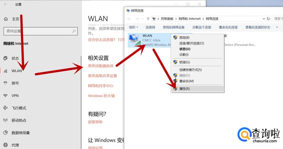 打开电脑“设置”,进入“WiFi”,接着点击“更改适配置选项”。进入界面,用鼠标右键点击网络,选择“属性”。