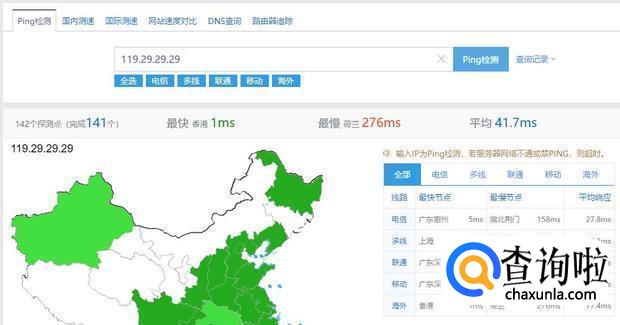 DNSPod:最快节点:香港延迟1ms,最慢节点:荷兰延迟276ms,平均:41.7ms