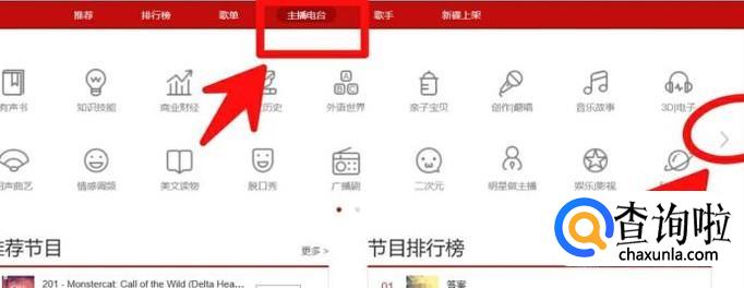 打开网易云音乐后点击上方的主播电台得到下面的页面,并且点击网页的右箭头