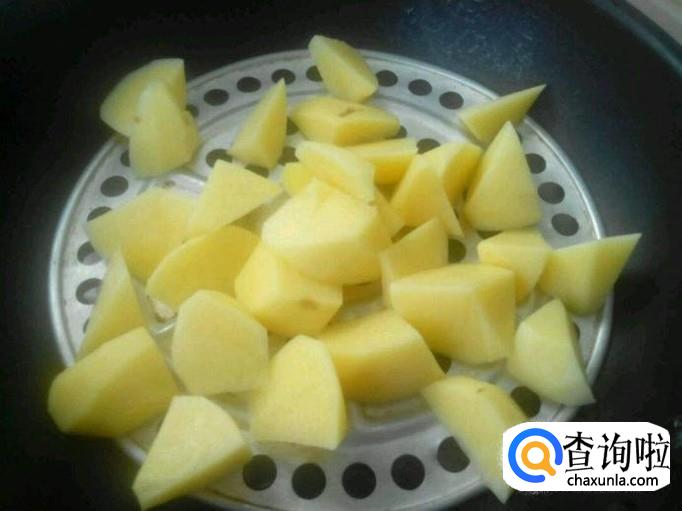 我们把切好的土豆块放入蒸锅里面蒸,蒸熟后把土豆杵成土豆泥备用。