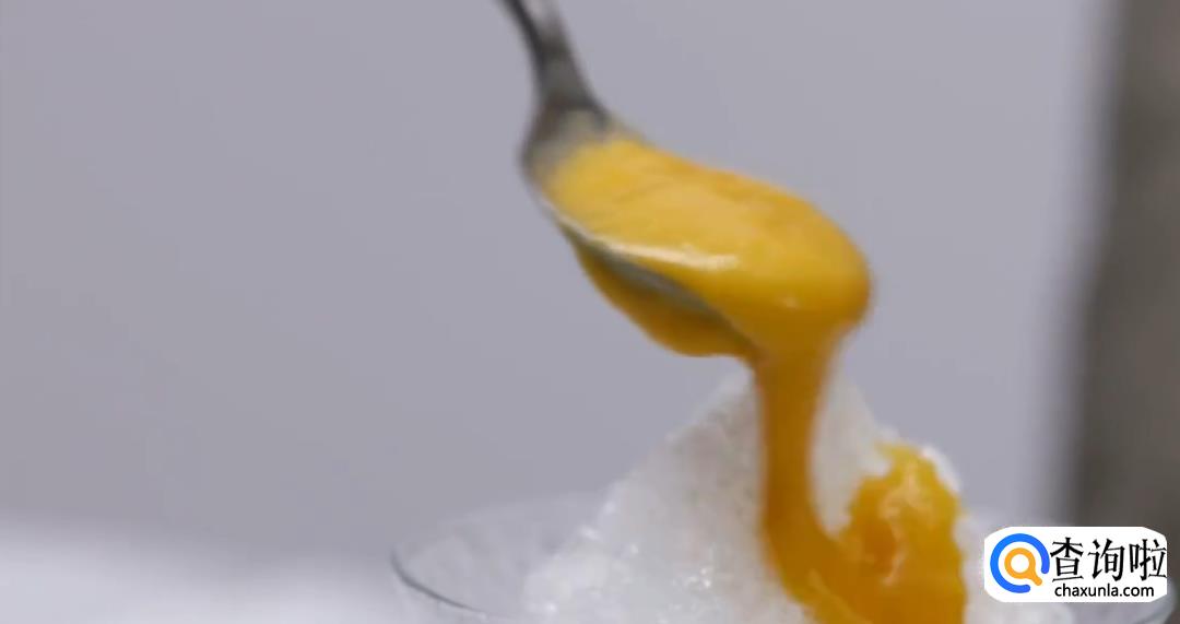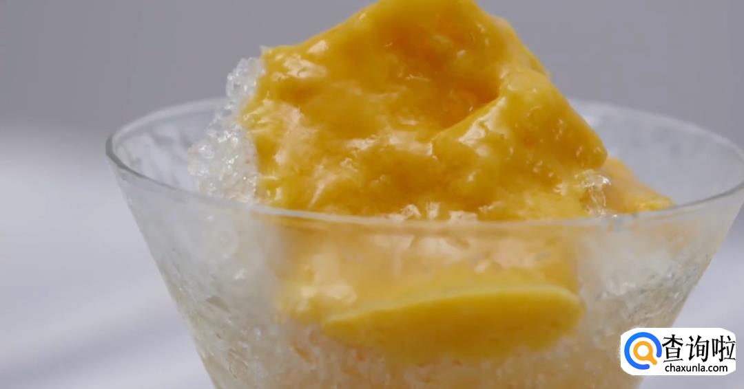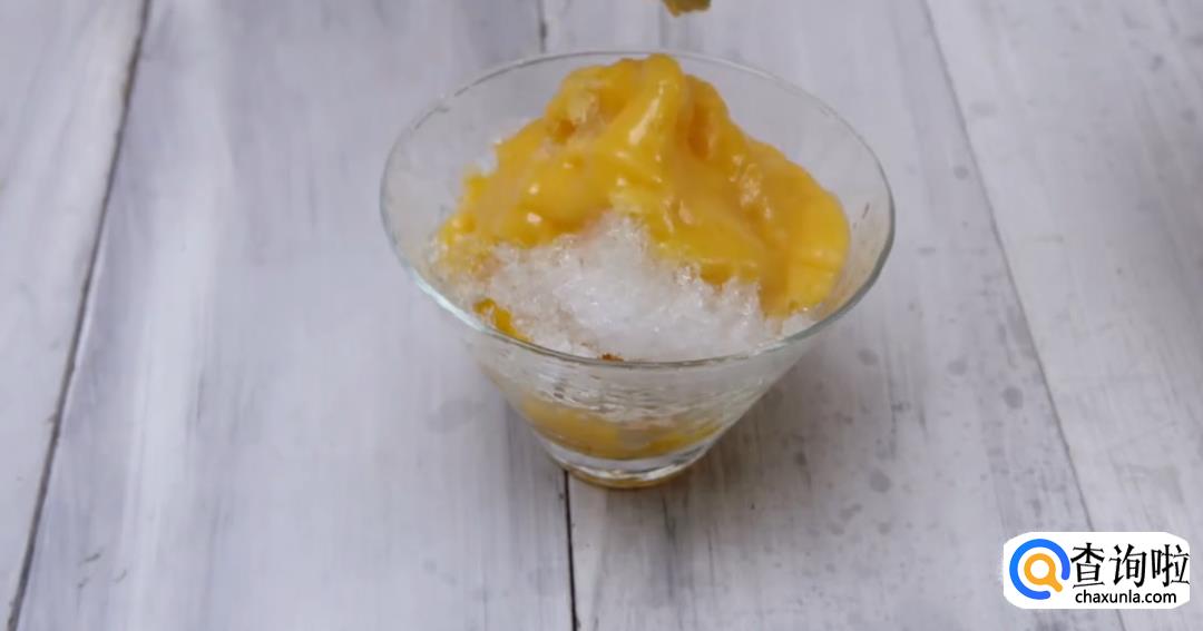 将芒果酱淋在刨冰上即可。