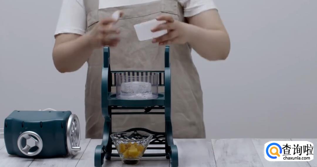 冰块脱模,放入刨冰机。在碗中放入芒果丁打底,制作刨冰。