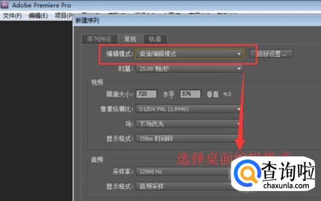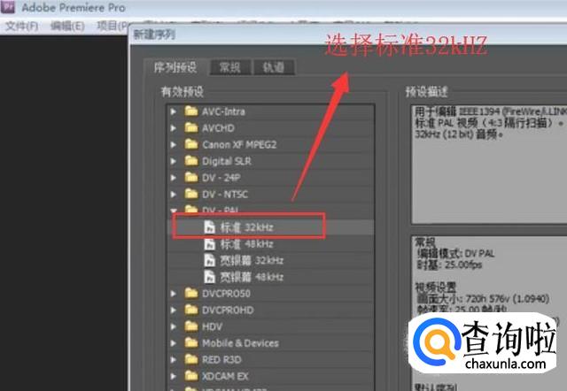 首先打开Premiere软件,调出新建序列界面,选择预设标准为32kHZ,如下图所示