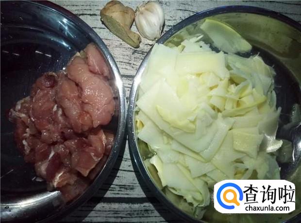准备好所有材料:竹笋、瘦肉、姜、蒜、葱。