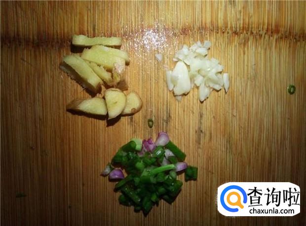 姜、蒜、葱,切碎,备用。