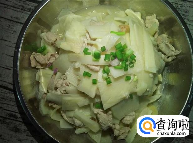 撒上葱花,即可装盆,享受美味的竹笋炒肉了。