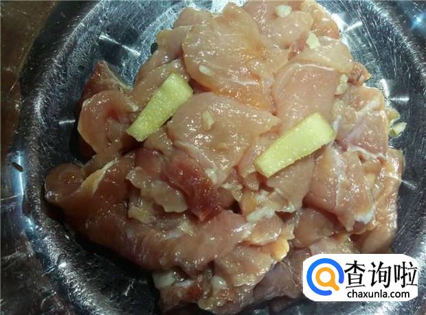 瘦肉切片,放入适量的花生油、酱油、料酒、姜,先腌制十分钟。