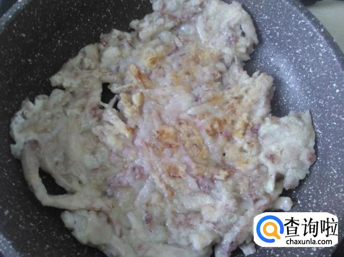 把芋头粉团放到锅里用锅铲压薄,用小火煎,一边煎一边轻轻要动平底锅。