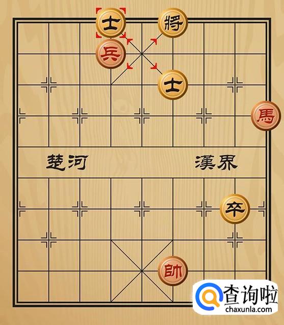 红方先走帅五平四,黑方走士5退4(若是黑方不走士5退4,而是走将6进1,则红方只需走马一退三,下一步无论黑方走将还是走士,都会被黑方吃掉一个士)。