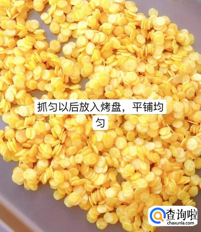 然后把玉米片放到烤盘中平铺均匀,如下图所示。